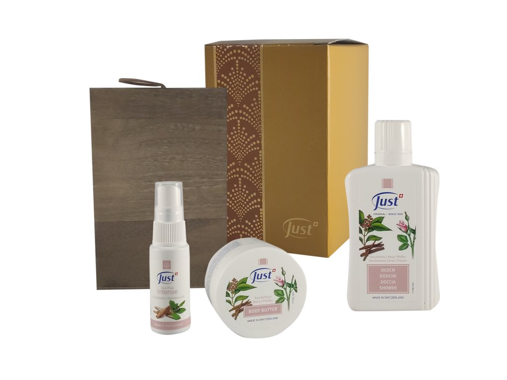 Z přírodní kosmetiky Just přichází exkluzivní edice se santalovým dřevem – vůní, která spojuje hloubku, jemnost a harmonii. Kombinace ušlechtilých esencí potěší nejen pokožku, ale i všechny smysly. V srdci této sady stojí éterický olej ze santalového dřeva, jehož sofistikované aroma dodává celé kompozici výjimečný charakter. Sprchový gel se santalovým dřevem, sametově hebké tělové máslo a Deo Plus Sandalwood vytvářejí dokonalý rituál pro chvíle luxusní osobní péče a naprosté pohody. Celá sada je navíc uložena v elegantní dřevěné krabičce z paulovnie, která podtrhuje její exkluzivitu.